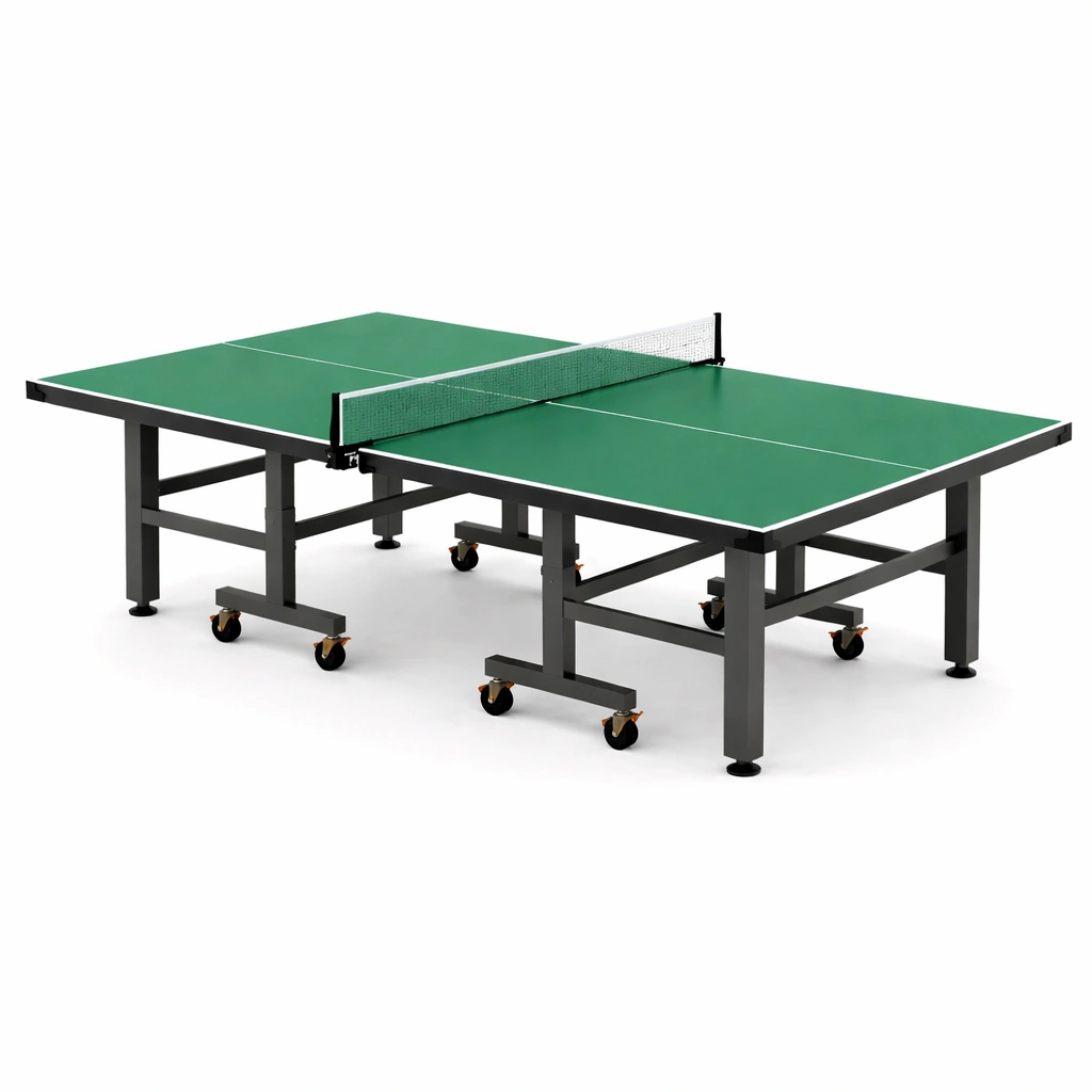 Die Tischtennisplatte besteht aus einer Oberfläche aus Spanplatte und einem Rahmen sowie Beinen aus Stahl. Ihre Abmessungen betragen 274 cm x 152.5 cm x 76 cm, und das Gewicht ist 65 kg. Die Platte ist in der Farbe Grün erhältlich. Sie lässt sich zur platzsparenden Lagerung zusammenklappen und ist mit Rollen ausgestattet, um eine einfache Bewegung zu ermöglichen. Zur Pflege wird empfohlen, die Oberfläche mit einem trockenen Tuch zu reinigen und sie vor Feuchtigkeit zu schützen. Geeignet für den Innenbereich.